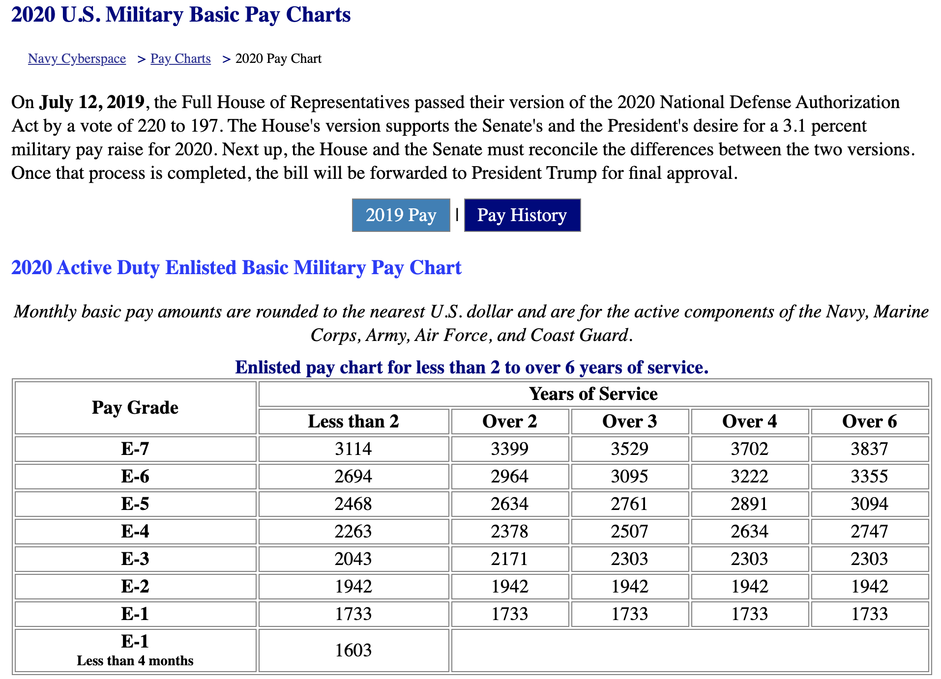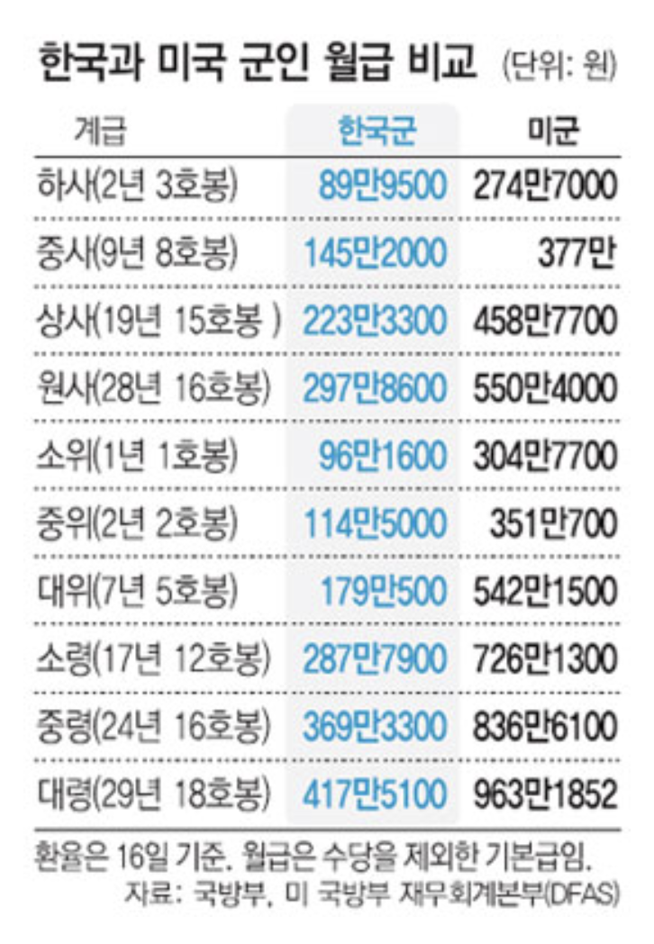 이쯤 되면 정말 좋아졌다고 볼 수도 있을 거 같습니다. 하지만 해외 군인들의 월급과 비교해 볼까요? 우선 징병제가 아닌 모병제를 택하고 있는 미국과 비교해 보겠습니다. 다음은 2020년 미국 군인의 기본 수당인데요. 참고로 이 기본 수당에는 다른 훈련 및 위험 수당들이 전혀 포함되지 않은 정말 기본 중의 기본 수당입니다. 참고로 E-1은 훈련병(1603달러)에 해당하며, E5(2468달러)는 병장에 해당합니다. 한국과 비교했을 때 약 3~4배에 해당하는 수준입니다. 물론 모병제이며, 미국이라는 점에서 차이가 나는 건 당연합니다.