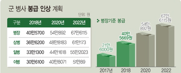 이와 대조적으로 징병제를 택하고 있는 싱가포르의 경우 2018년 기준으로 이등병은 약 42만원을 받습니다. 기타 수당을 합치면 50만원을 받는데요. 군 전역 후에는 약 800만원의 포상금과 주공 아파트를 제공합니다. 브라질의 경우에는 월 평균 24만원, 이스라엘은 약 40~50만원을 받으며 복무 중 휴가가 많고, 전역 후 많은 혜택이 주어집니다.