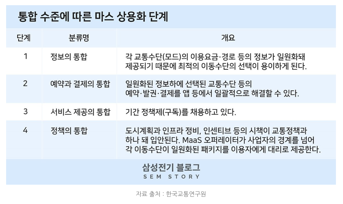 결국, 편리성과 시장성 때문입니다. 이런 서비스가 나오면 당연히 수요는 있을 것이고, 또 모빌리티 시장의 잠재력과 그 규모는 너도나도 뛰어들만큼 매력적이거든요. 여기서 라스트 마일의 개념이 꽤나 핵심적이기도 하는데요. 다들 한 번씩은 지하철을 타고 목적지에 도착해서 또 다시 버스를 타거나, 택시를 타거나, 걷는 일을 귀찮아하셨던 적이 있을 겁니다. 그럴 때 역 앞에 자전거나 전동 킥보드, 혹은 날 위한 택시가 뙇하고 기다리고 있다면 정말 편하겠죠? 이제 곧 그렇게 될 겁니다. 그리고 그것이 바로 아우디 같은 자동차 업체가 전동킥보드를 만드는 이유이기도 하죠. MaaS는 다음의 4단계를 걸쳐 상용화될 것으로 보입니다.