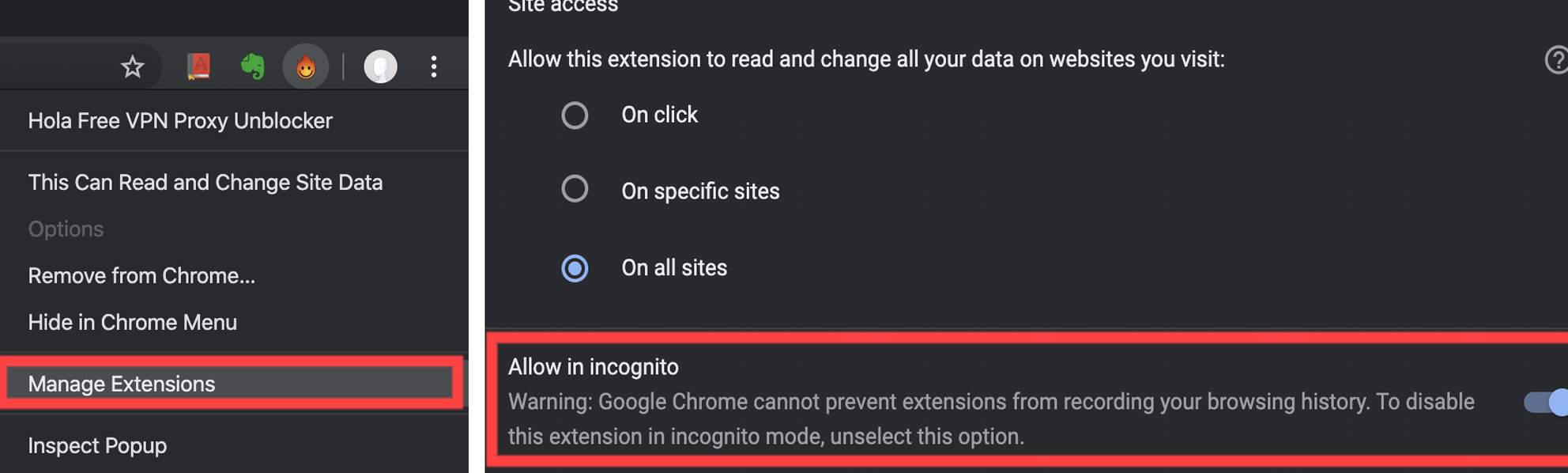 다음 주소로 접속해 크롬 브라우저에 Hola VPN 확장 프로그램을 설치합니다. 설치가 완료되면 우측 상단에서 VPN 아이콘을 발견할 수 있습니다. 이후 바로 사용이 가능하나 비밀 모드에서도 작동하게 하려면 설정으로 이동하여, 다음의 탭을 활성화시킵니다.