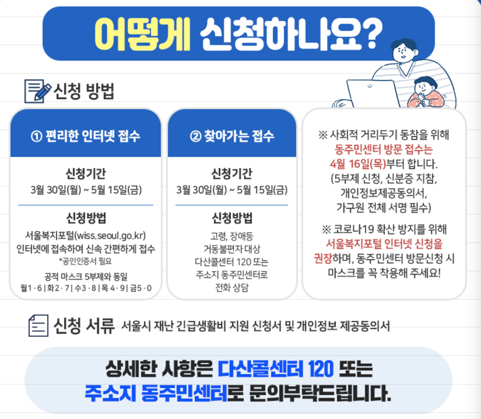 서울시 재난 긴급생활비 지원 신청(3.30~5.15) 재난 긴급생활비 지원 안내사항 신청 대상 :2020.3.18. 0시 기준 서울시 거주가구, 중위소득 100% 이하 신청 제외자 : 기존의 정부지원 혜택가구 제외 신청인의 출생연도 마지막 자리에 따라 요일별 접수 저소득층 한시생활지원사업(기초생활수급자, 차상위계층) 특별돌봄쿠폰(아동수당) 긴급복지지원 또는 서울형 긴급복지지원(생계비) 코로나19 생활지원비 지원(14일 이상 입원·격리자) 코로나19 유급휴