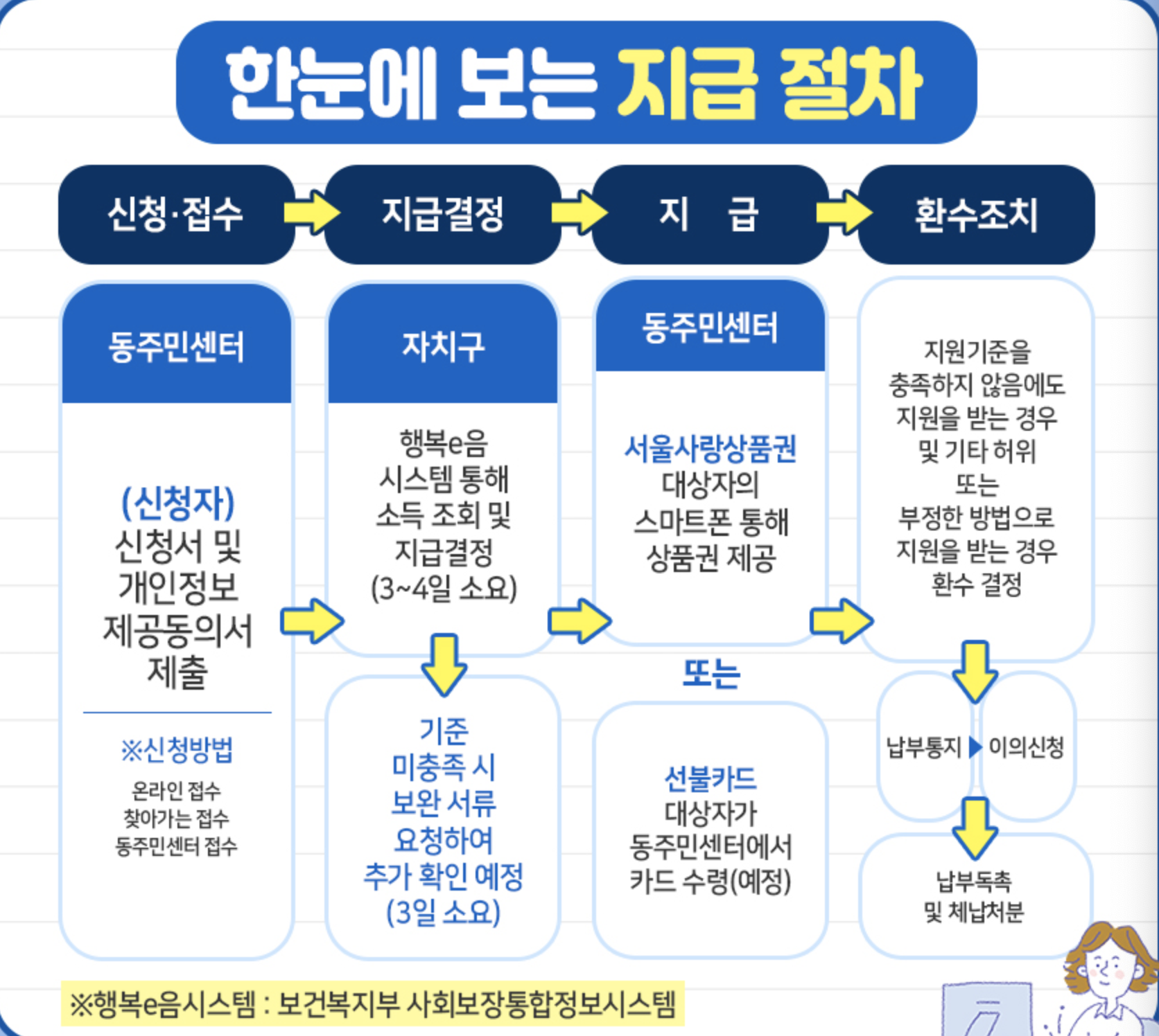 서울사랑상품권 혹은 선불카드로 지원금을 지급하며, 사용기한은 2020년 6월말 까지입니다. 상품권의 경우 지역 내 제로페이 가맹점에서 사용가능하며, 선불카드는 지역 내 식당, 마트, 편의점 등에서 사용할 수 있습니다. 지급 결정 여부는 신청일로부터 최소 1주일 이상이 소요됩니다.