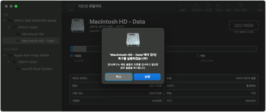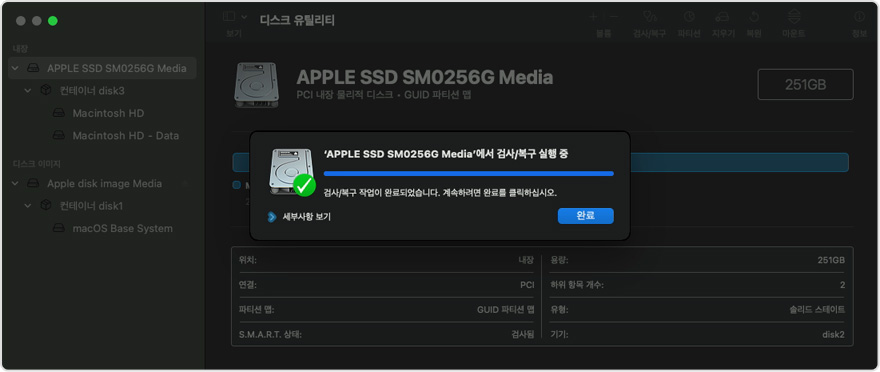 위 방법으로도 해결되지 않을 경우에는 디스크 유틸리티를 통해 디스크를 검사하고 복구해야 합니다.