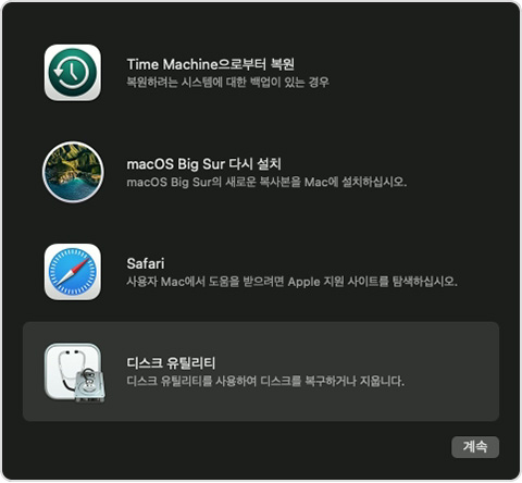 맥을 재부팅합니다. 부팅이 되기 전 command(⌘)-R를 길게 누르면, 다음과 같은 복구 환경에 접속할 수 있습니다. 디스크 유틸리티에 들어갑니다.