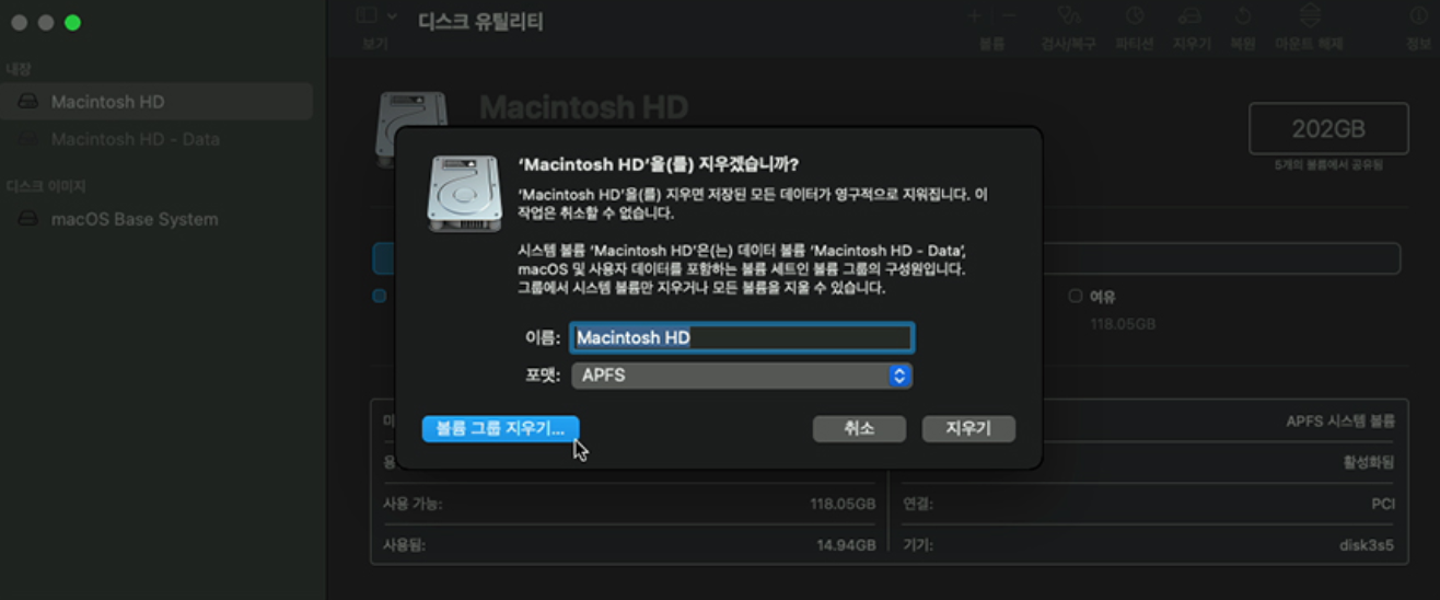 만약, 컴퓨터가 수십 분째 멈추거나 복구가 진행되지 않는 경우 포맷을 진행해야 윈도우를 설치할 수 있습니다. 포맷을 하면 기존 데이터가 모두 날아가니 진행 전 백업을 진행하시기 바랍니다. 백업을 마치셨다면, '볼륨 지우기'를 통해 백업을 진행할 수 있으며, 포맷은 APFS를 선택합니다.