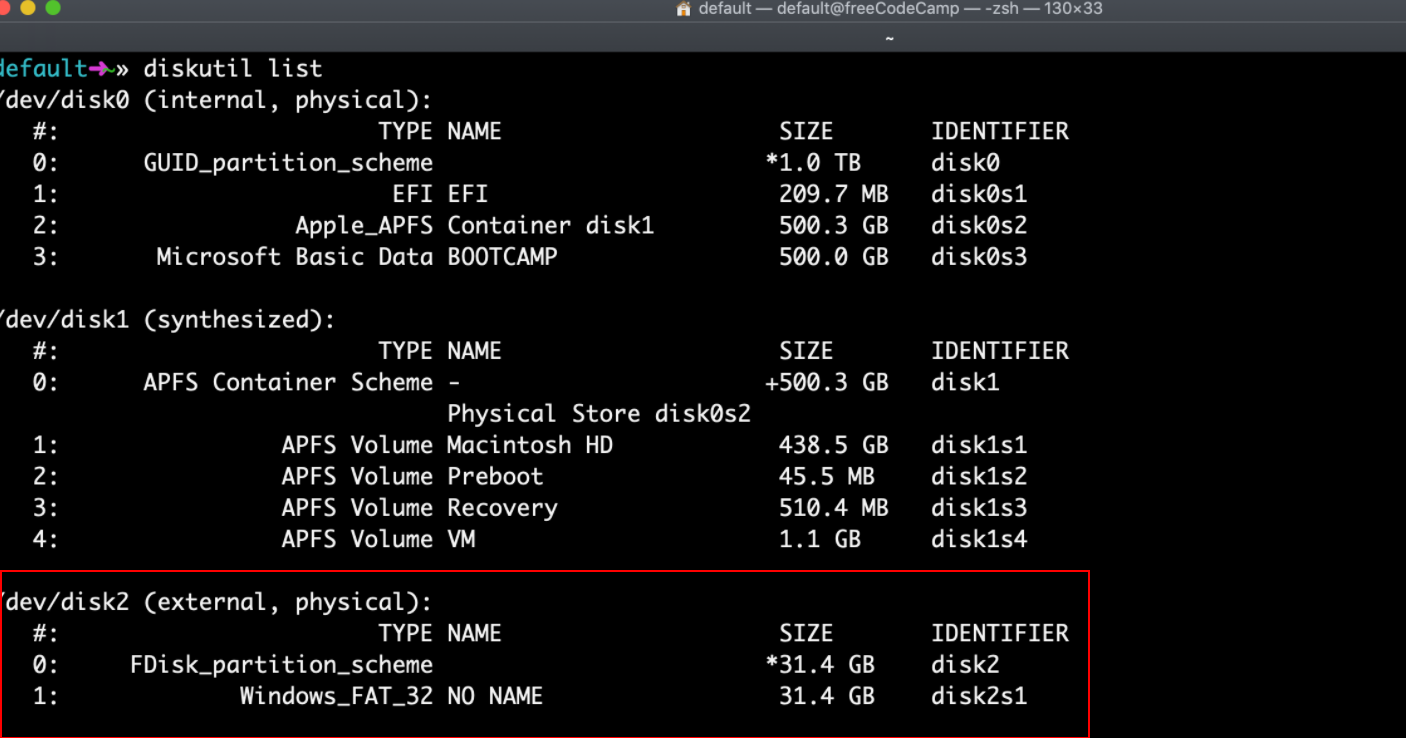 터미널에서 diskutil list을 입력하면 USB 장치의 디스크 번호를 확인할 수 있습니다. 이는 (external, physical)로 표시될 것이며 SIZE를 통해 정확한 USB인지 최종적으로 확인합니다.