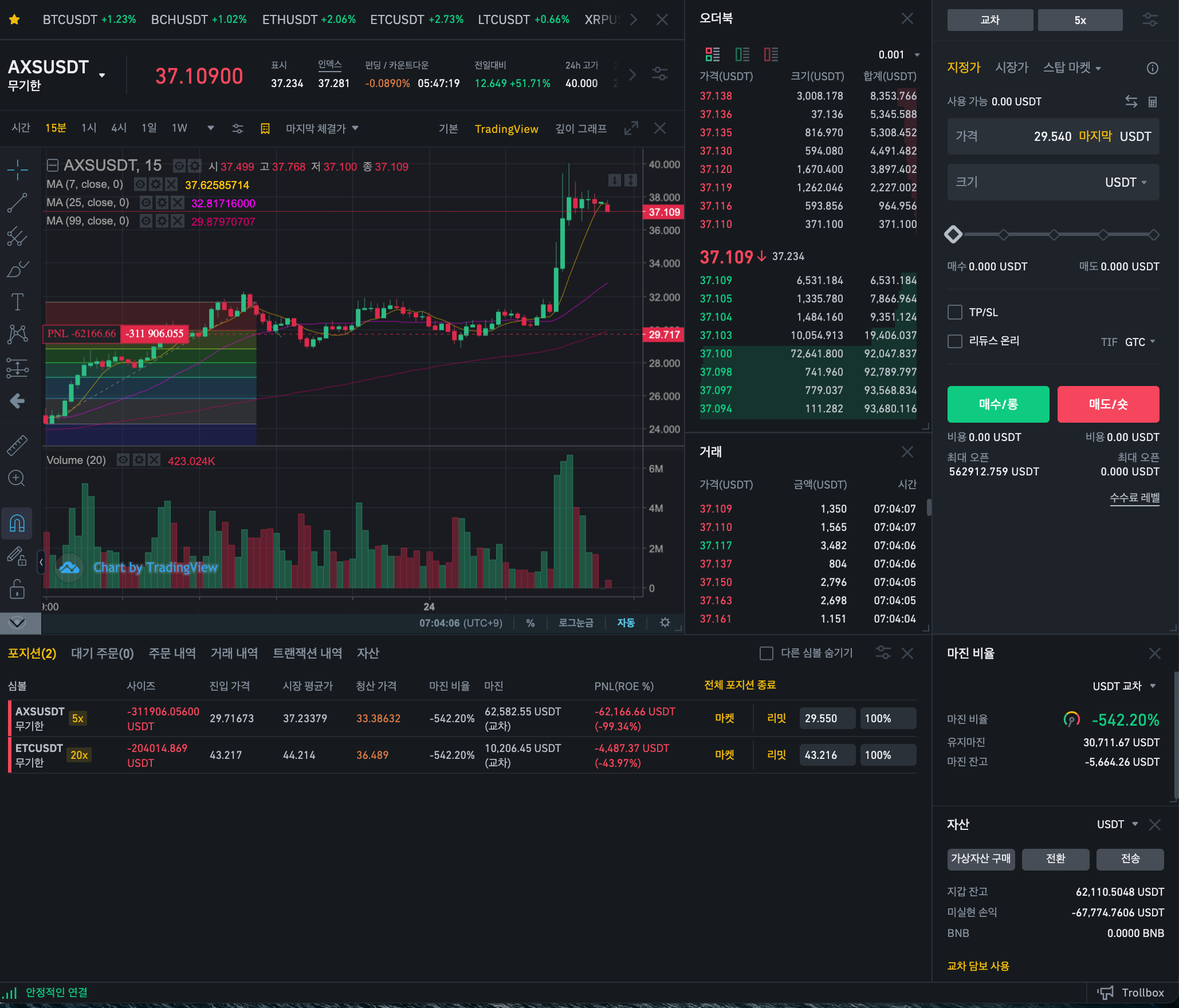 무얼 한 걸까? 하루 만에 5천만원을 날렸다. 자그마치 술을 쳐먹고 큰 포지션을 잡아놓고 잤다. 아래 스샷은 일어나서 확인한 매매창. 6천 5백만원의 시드 중에서 약 5천만원이 날아가 있었다. (중간에 컴퓨터가 대기모드로 들어가서 미실현 PNL이 최대치로 찍혀있지만, 어쨌거나 잔고에 딱 1천만원이 남아있었다.)