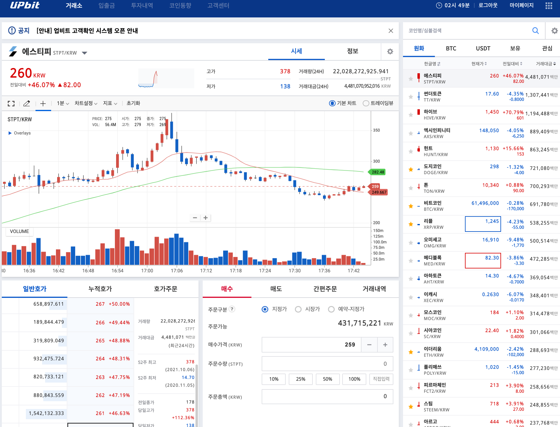 에스티피가 140원 대에서 놀고 있는 걸 보고 주울까 하다가 설마하고 관망. 잠깐 밖에 나갔다 집에 오니 200원 돌파. 숨도 안 쉬고 300원 돌파. 오르는 말에 올라탈 수는 없고 300 -> 270 -> 240 깨질 때마다 단기 반등 먹고 1%, 2% 짧게 익절.