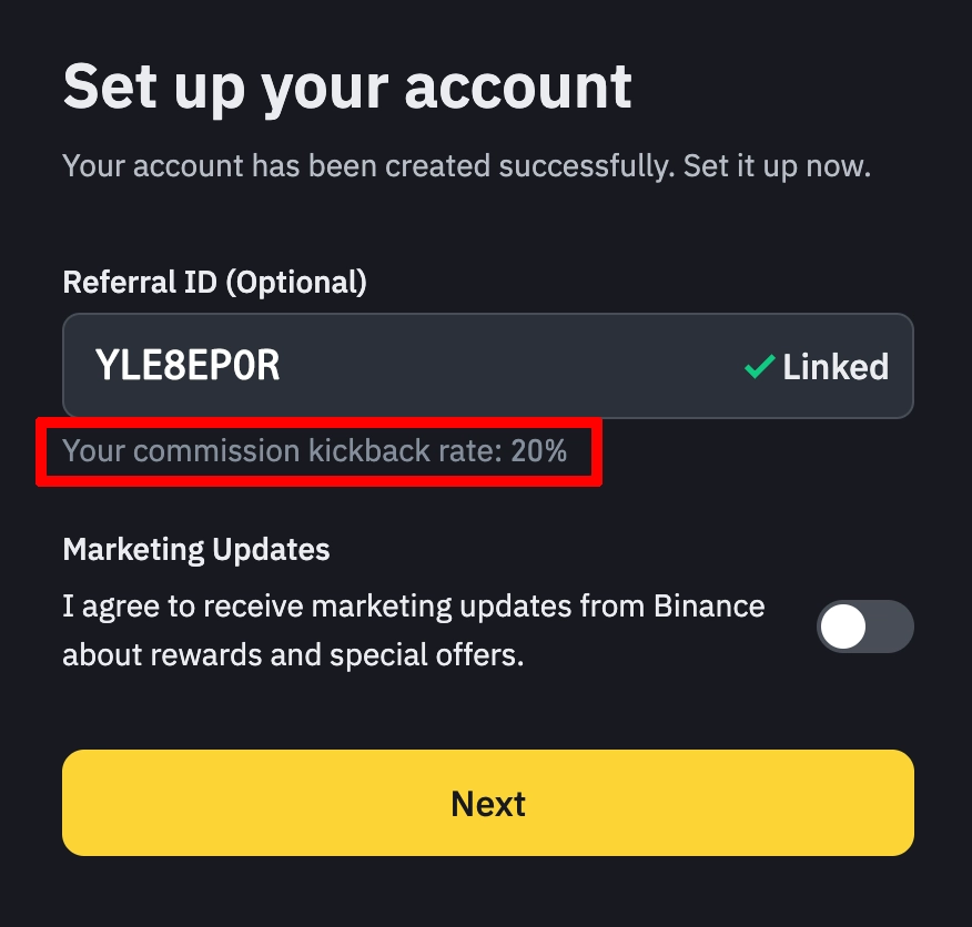 첫 번째 할인 방법입니다. 바이낸스 레퍼럴 20% 할인을 받으려면 거래소에 가입하며 레퍼럴 코드 ID에 YLE8EP0R 입력하세요.