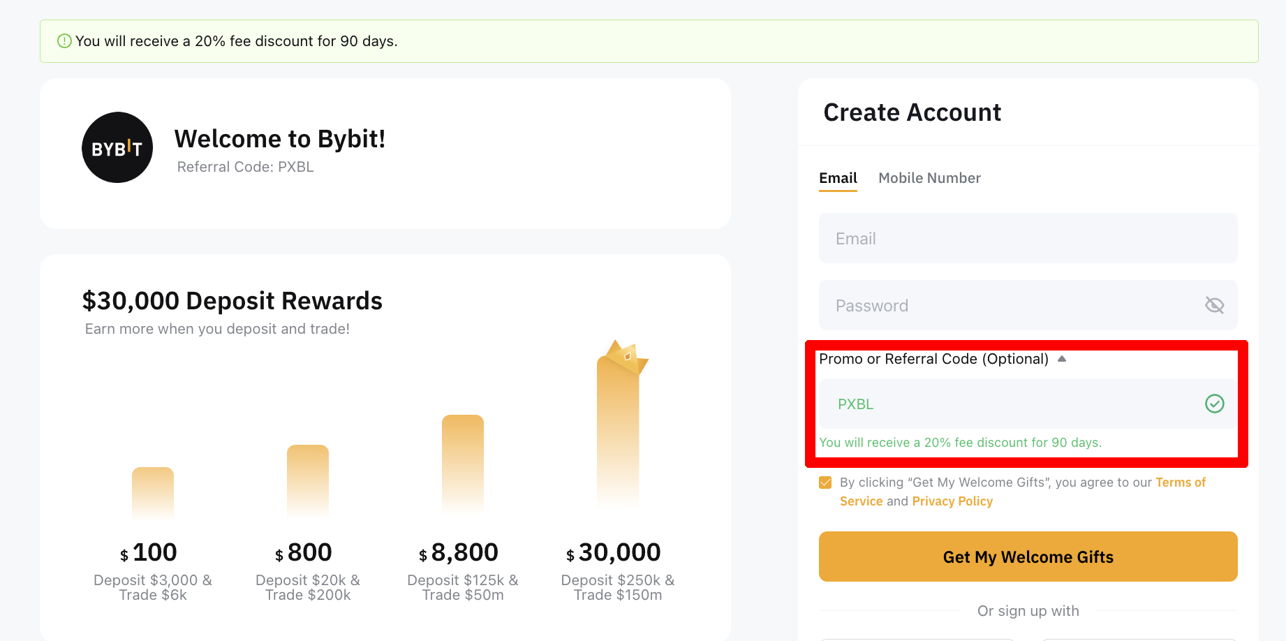 먼저, 바이비트 거래소에 신규 가입하시며 수수료 할인을 받으시려면 가입시 레퍼럴 코드에 PXBL을 입력하시면 됩니다. 또는 아래 링크를 클릭하시면 20% 할인 코드가 자동으로 적용된 회원가입 페이지로 이동합니다.