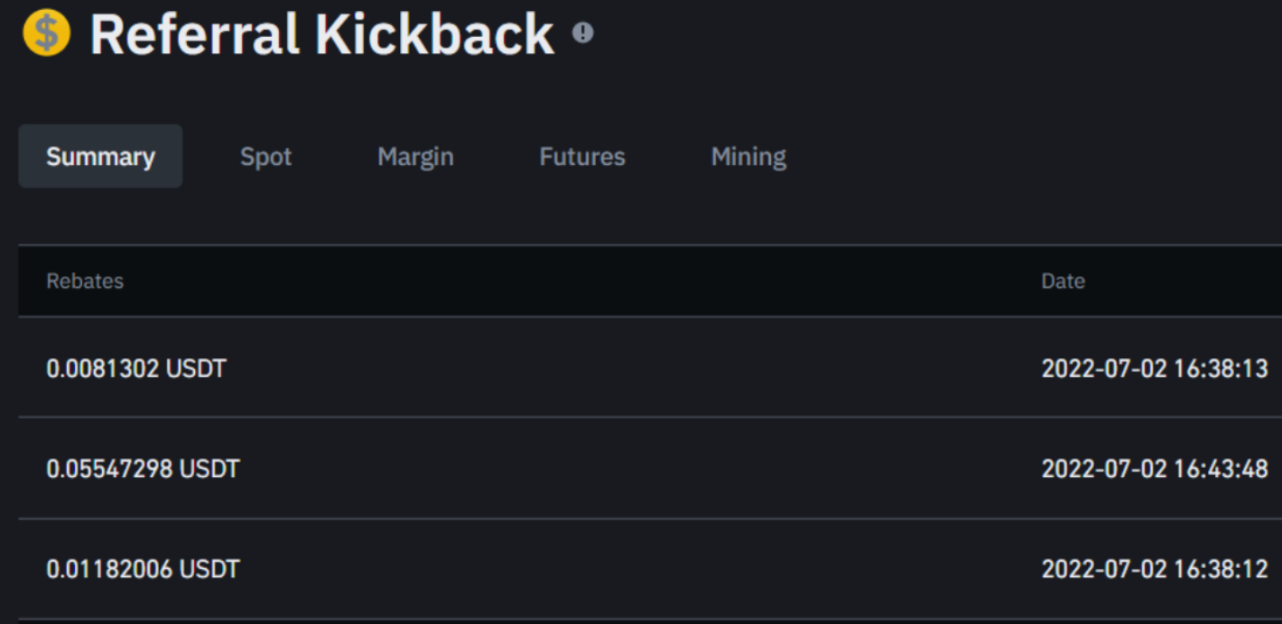 그런 다음 아래로 스크롤을 내리면 [Referral Kickback]이라는 것이 보일 것입니다. 여기를 클릭하면 지불한 수수료에서 20%가 할인되어 킥백(되돌려 받음)되었음을 직접 확인하실 수 있습니다.