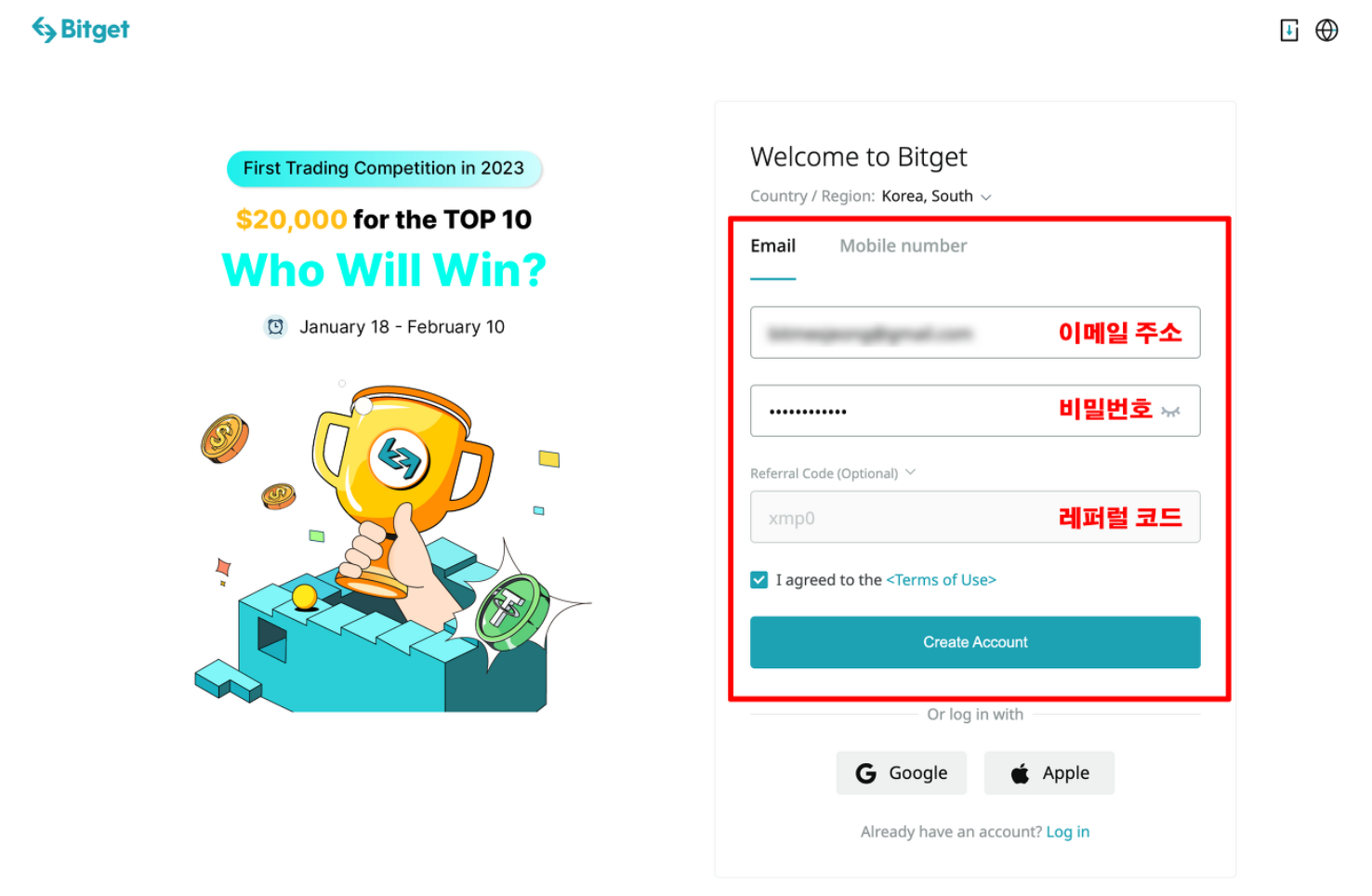 이제 비트겟 거래소 가입 방법을 안내해드릴게요. 이메일과 비밀번호만 입력하면 간편하게 계정을 생성할 수 있는데요. 위 스크린샷을 참고하셔서 비트겟에서 사용할 이메일, 비밀번호, 레퍼럴 코드를 차례대로 입력하세요.