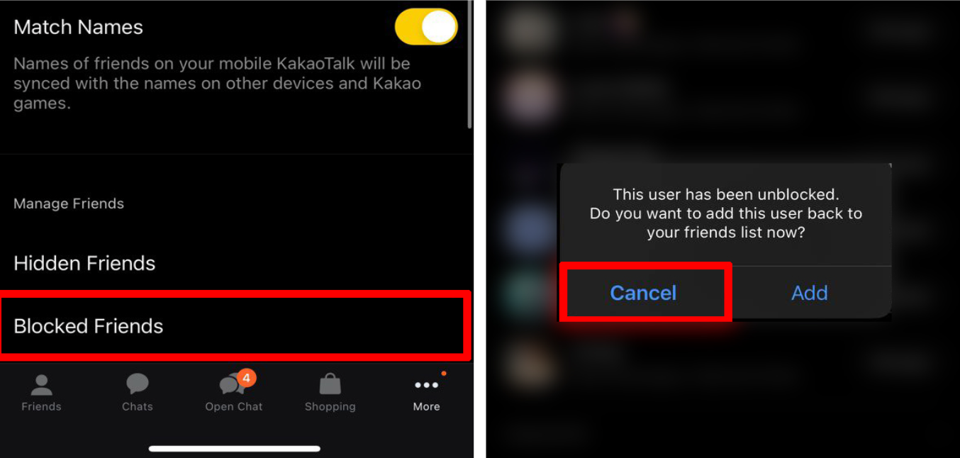2. 차단한 상대방을 해제하고 친구에 다시 추가하지 않기를 누릅니다.