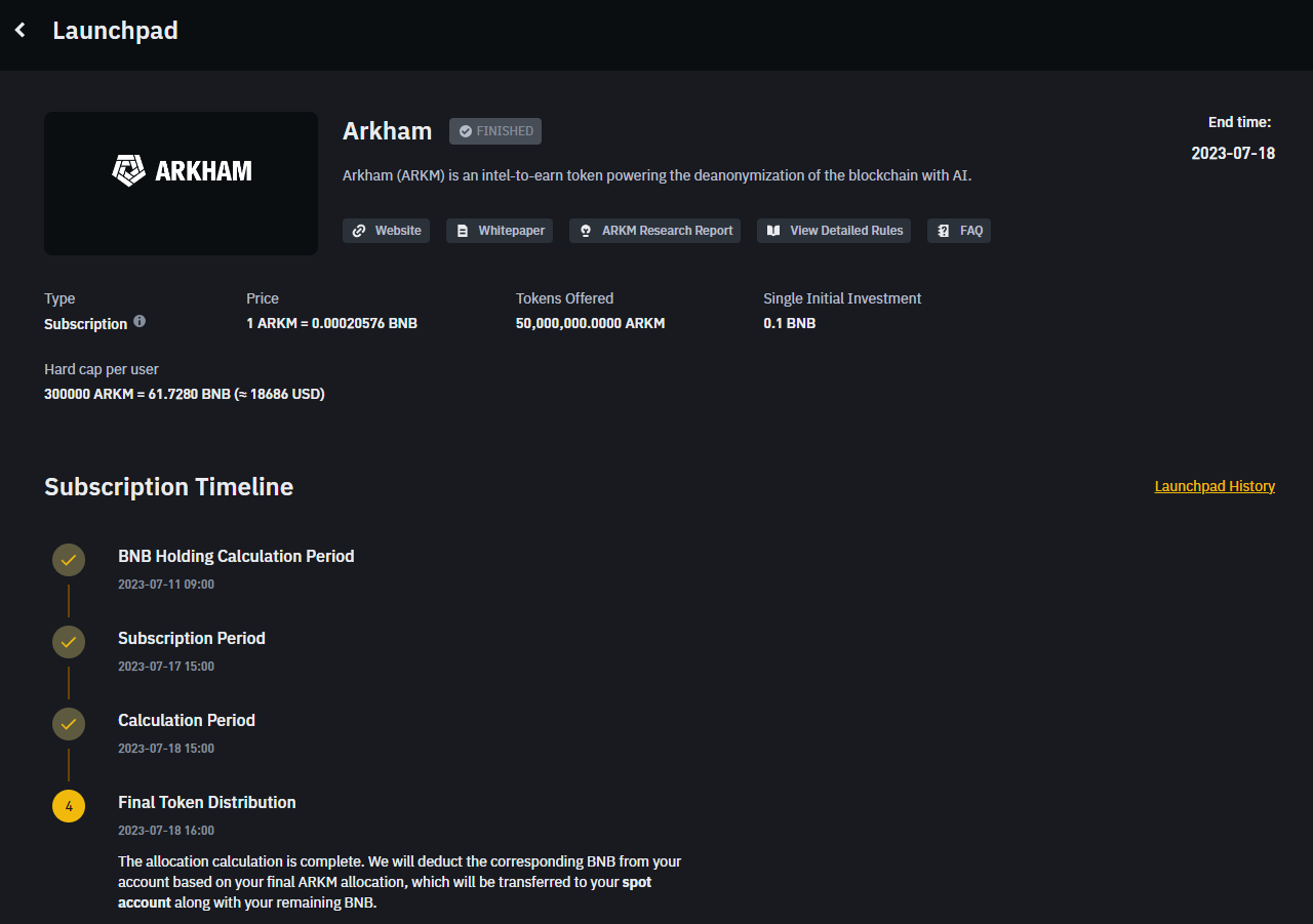 다음은 이전에 진행되었던 아캄(ARKHAM) 런치패드 토큰 세일입니다. 현재는 신청 기간이 마감되어 토큰 세일이 종료되었지만, 이를 통해 전반적인 런치패드 진행 일정을 확인하실 수 있습니다.