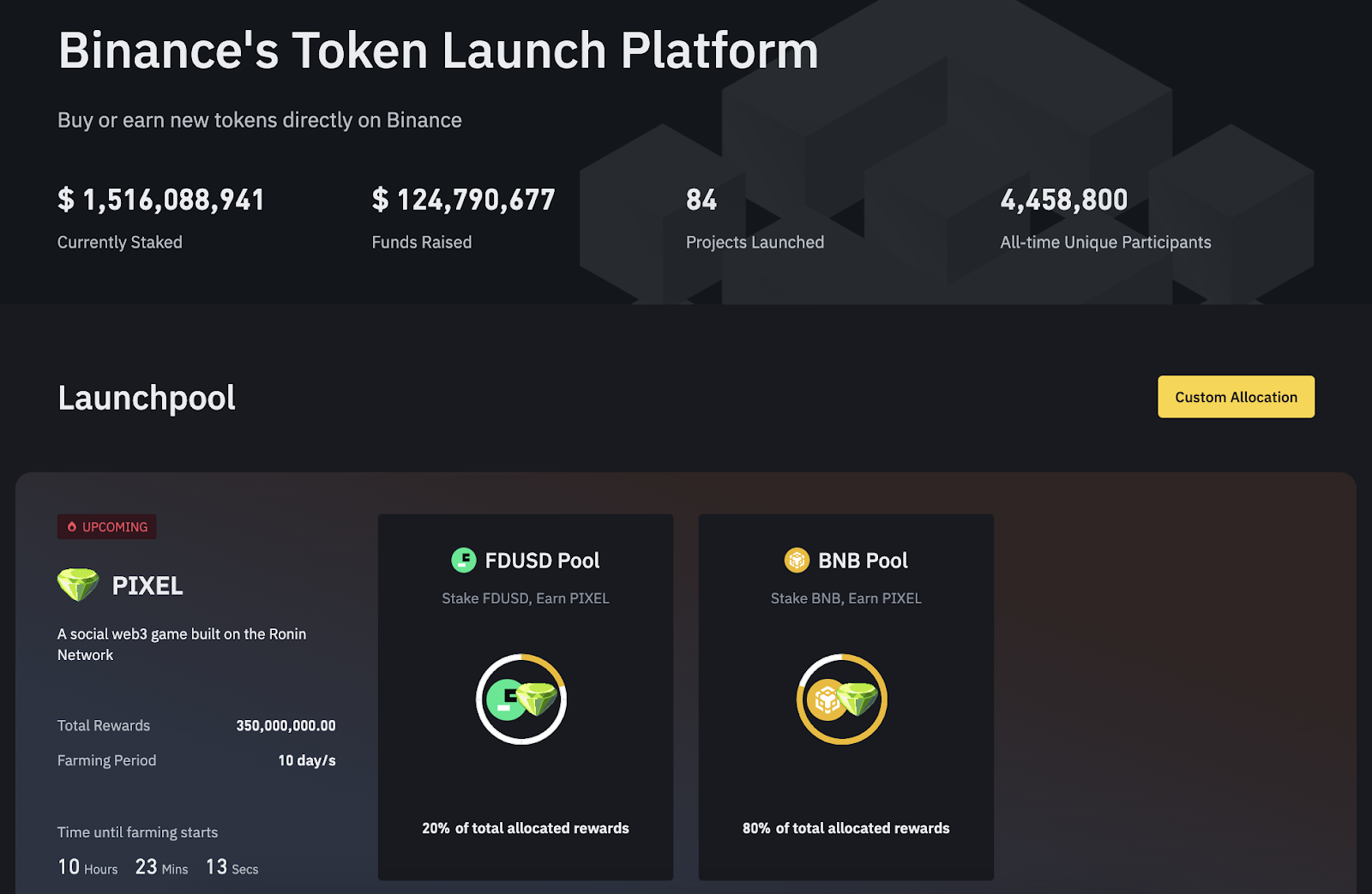 런치패드는 BNB를 청약하고 당첨 비율만큼 토큰을 교환하는 방식이고, 런치풀은 BNB 또는 FDUSD를 스테이킹하고 해당 비율만큼 신규 토큰 및 코인을 보상으로 받는 방식입니다.
