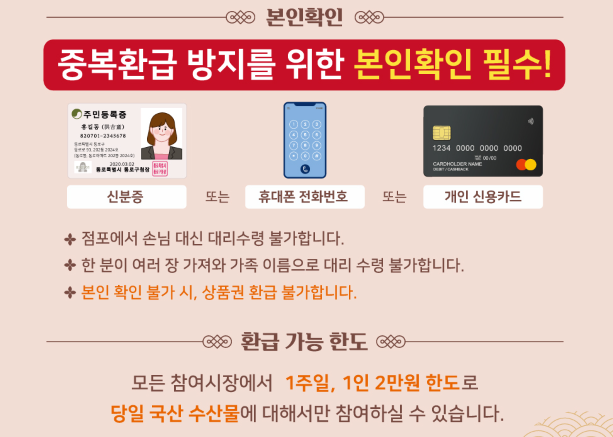 환급을 받기 위해서는 구매 당일에 발급된 영수증을 지참해야 하며 신분증을 반드시 지참해야 합니다. 환급 대상은 현금, 신용카드, 온누리상품권 등 어떤 결제 수단이든 무관하게 환급을 받으실 수 있습니다.