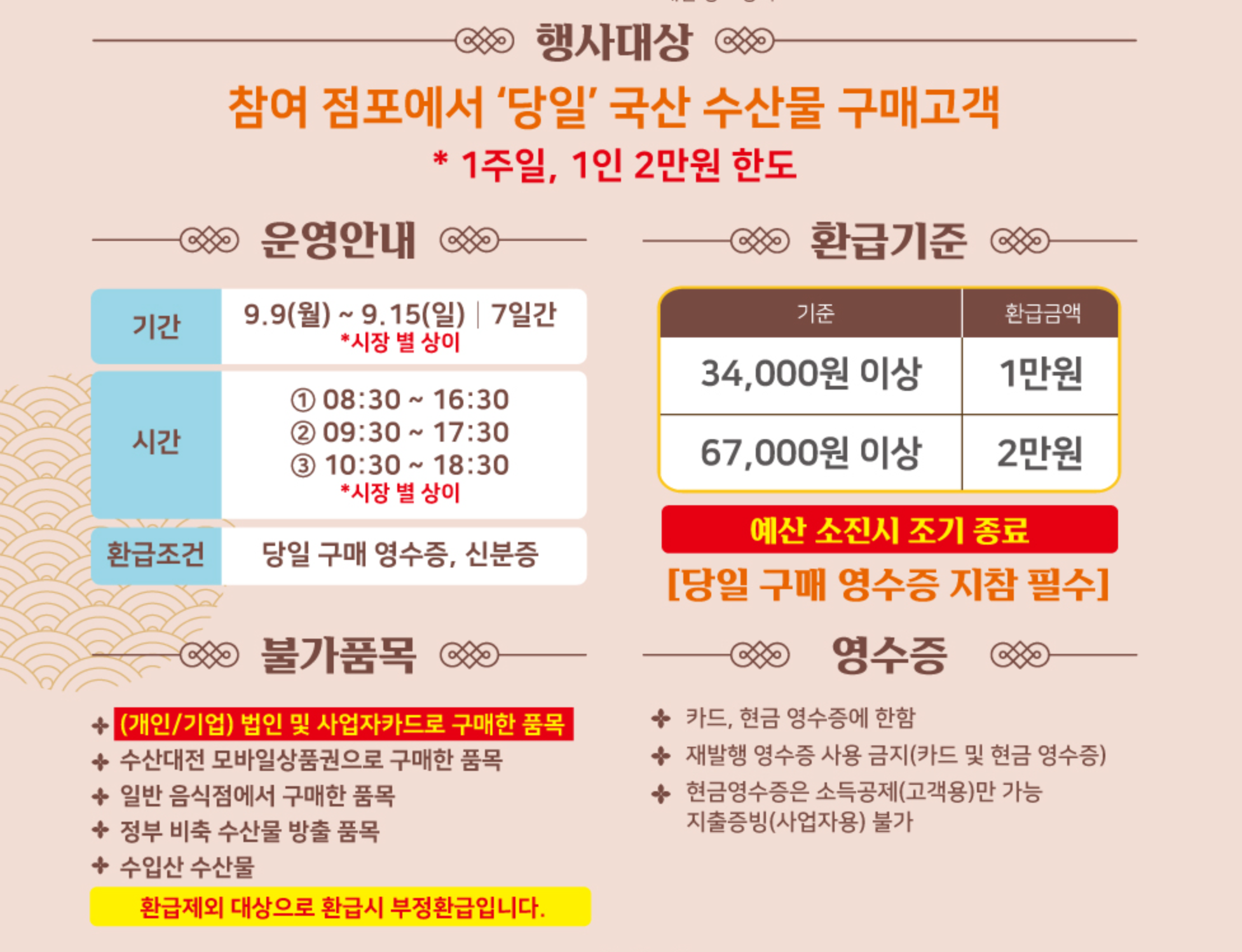 농축산물은 34,000원 이상 구매 시 1만원, 67,000원 이상 구매 시 2만원을 환급받을 수 있으며, 수산물도 동일한 조건으로 최대 2만원까지 환급이 가능합니다. 따라서 농축산물과 수산물을 모두 구매할 경우 총합 최대 4만원까지 환급받을 수 있습니다.